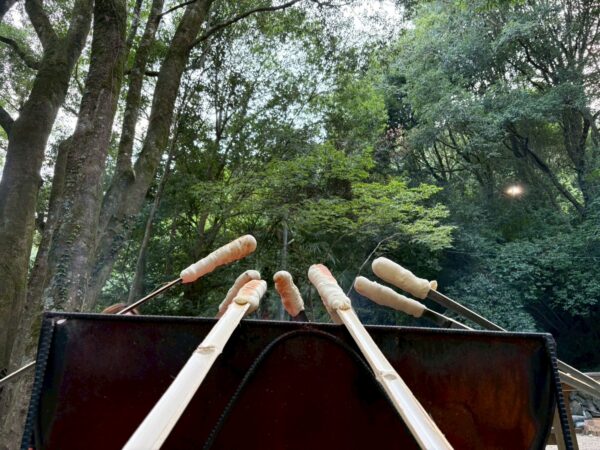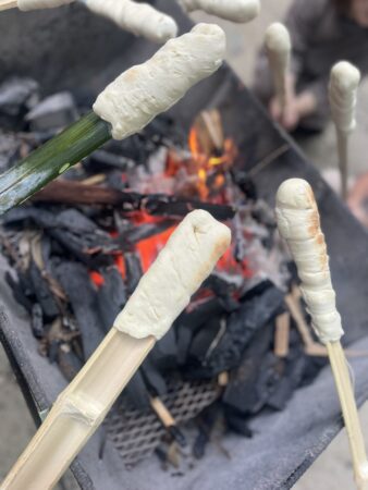 切った竹にパン生地をくるくると巻きつけて、炭火でじっくり焼いていきます♪