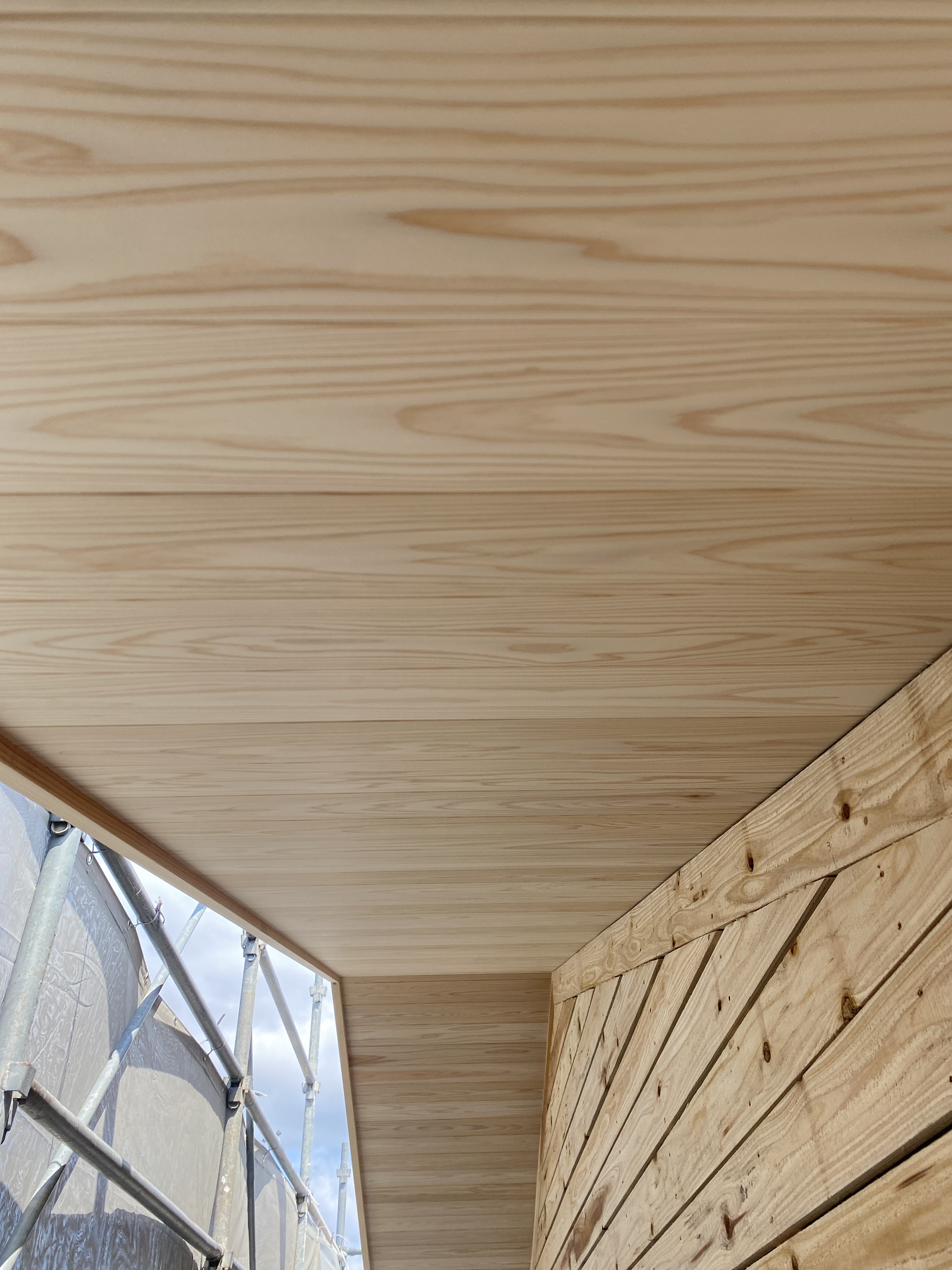 こんにちは 兵頭です 新築工事中の現場で、 大工さんに軒天のスギ板を貼っていただきました 外からも木の温かみを感じ……more