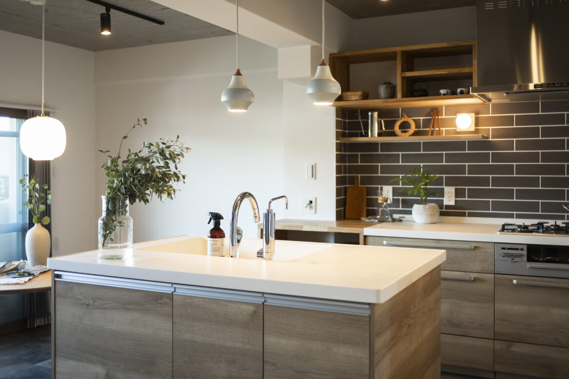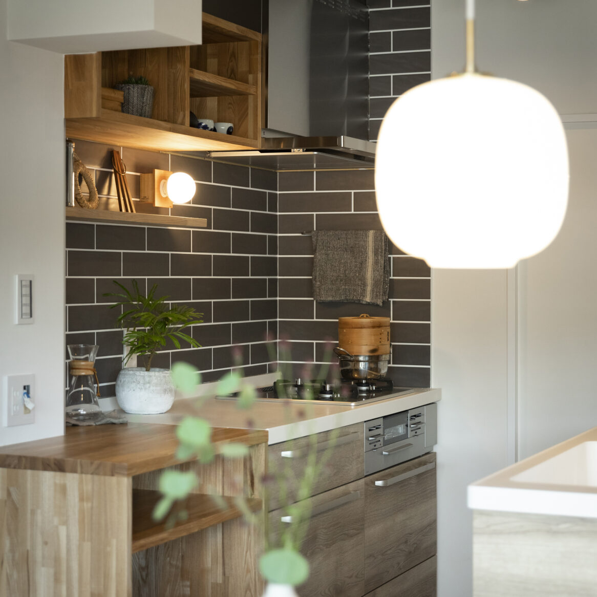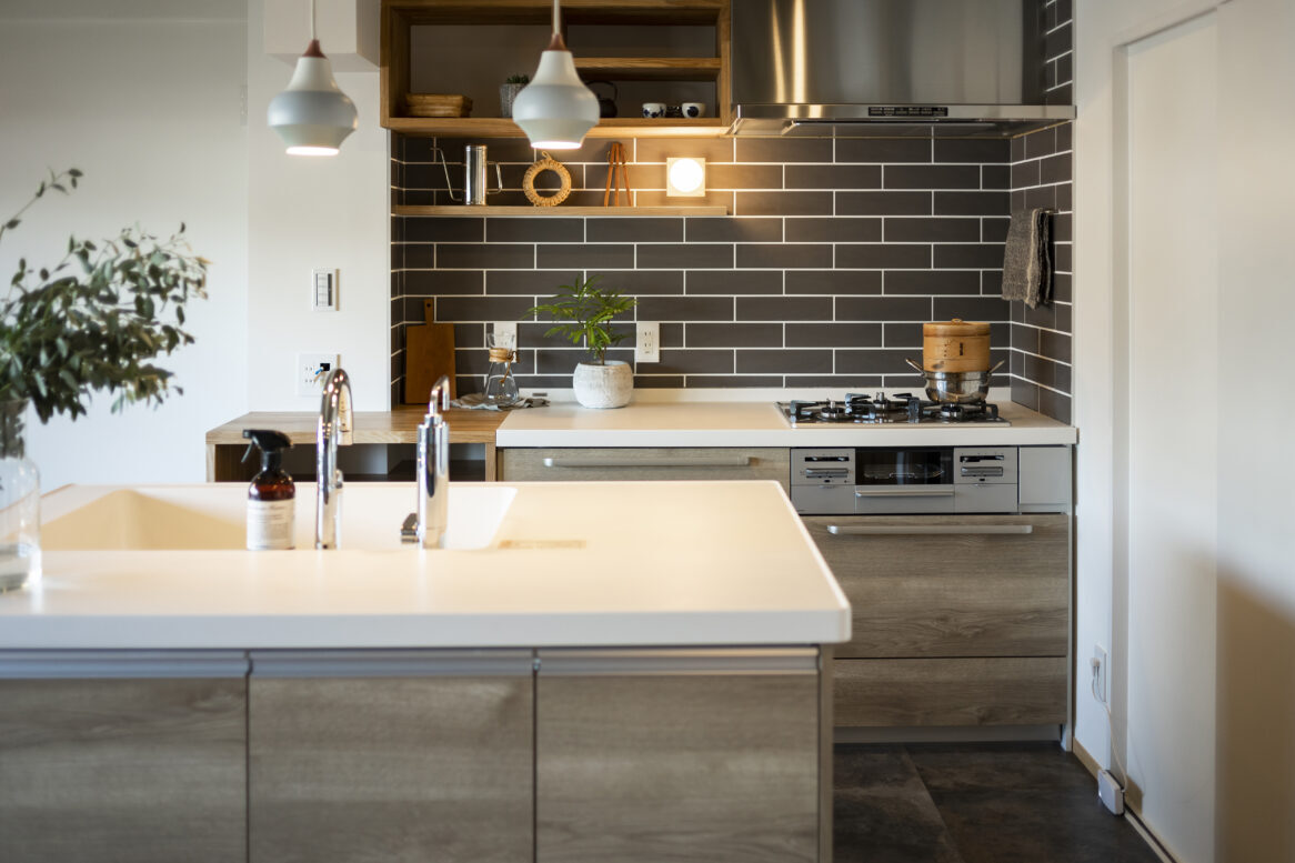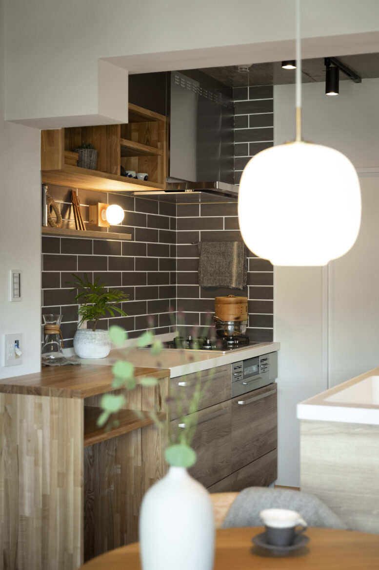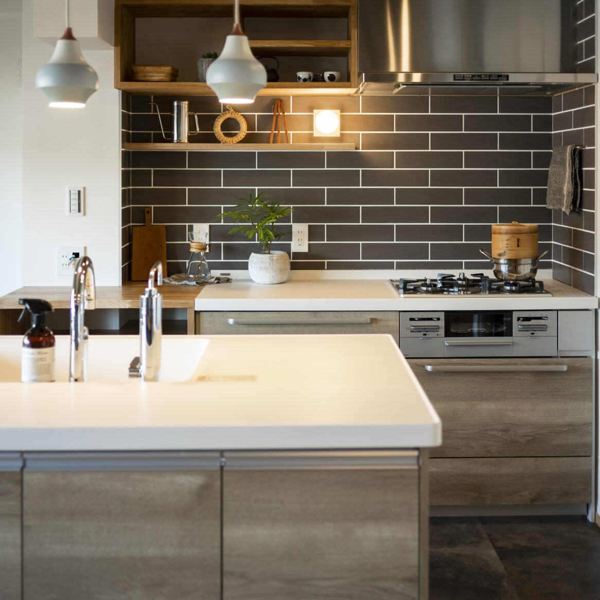 濃いグレーのクロスやタイルを組み合わせることで、上質でスタイリッシュな雰囲気を演出しています。