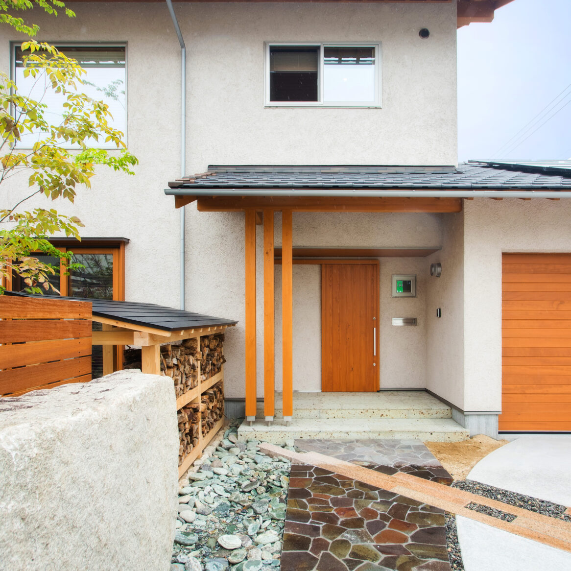 環境へのやさしさを大切に考えておられるご家族の想いを叶えた、自然の恵みを感じながら心地よく暮らせる家。県産材や大谷石などの自然素材を使い、その風合いや性質を活かした美しく心地いい住まい。太陽光発電と太陽熱利用システムを採用するZEH(ネット・ゼロ・エネルギー・ハウス)に加え、雨水利用システムも設置。広い庭で家庭菜園を、冬には薪を焚く暮らしを、楽しめます。家族共用の書斎や、洗いもの専用スペースを設けたキッチン、エクステリアとしてデザインした薪棚、2台分のインナーガレージなど、こだわりいっぱいです。