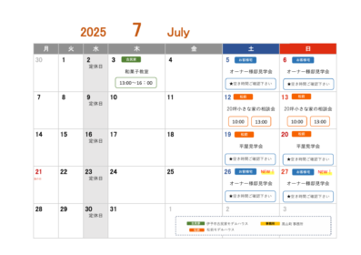 8月のイベントカレンダーです! ①8/2(土)、8/3(日)オーナー様邸見学会【完全予…more